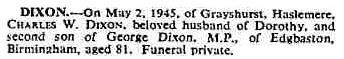 Charles Dixon died in 1945, aged 81. His second wife Dorothy survived him.